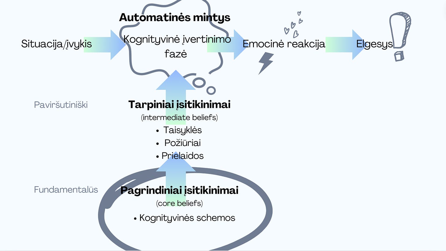 Paprastai ir sutrumpintai: Įsitikinimas —> Automatinė mintis —> Jausmas/Emocija —> Iš jausmo kylantis veiksmas